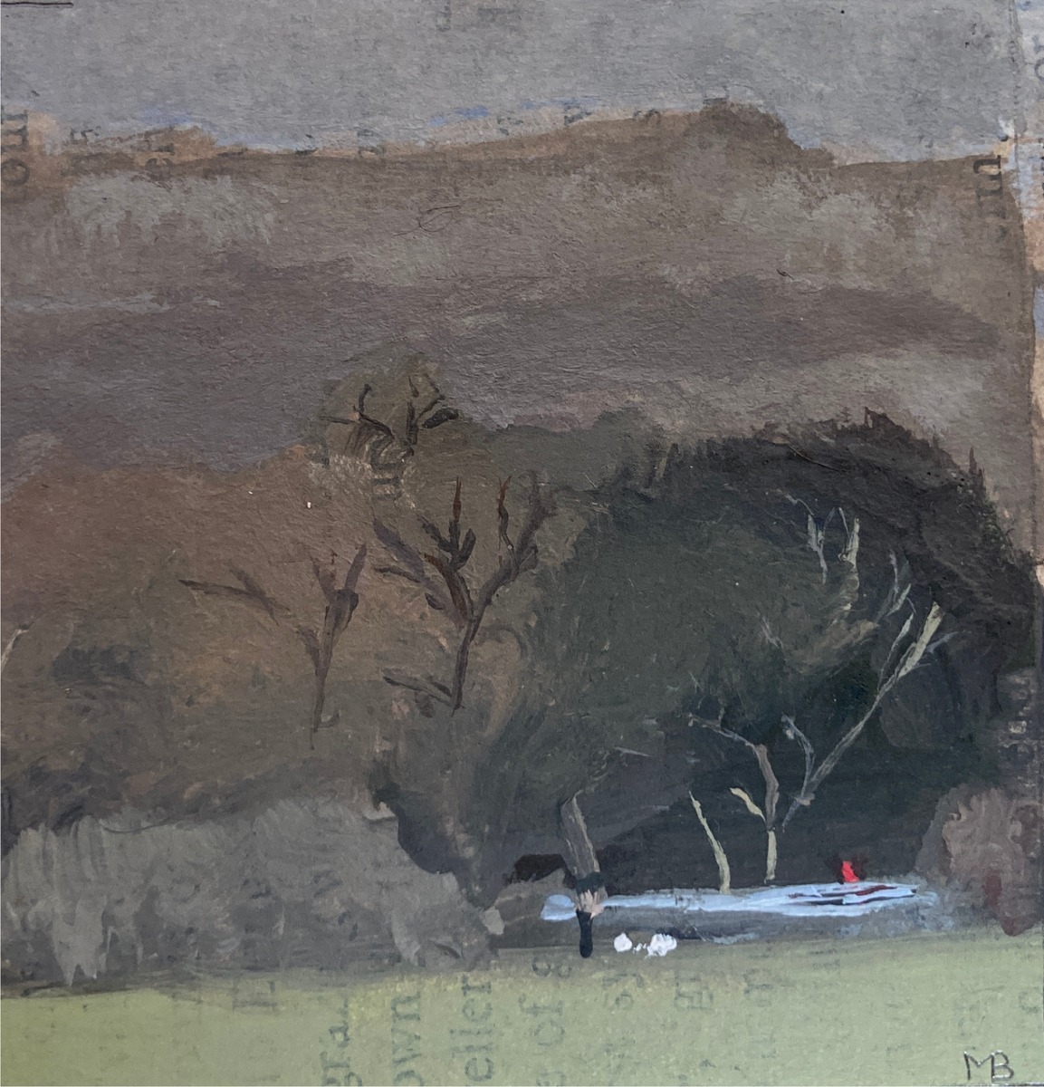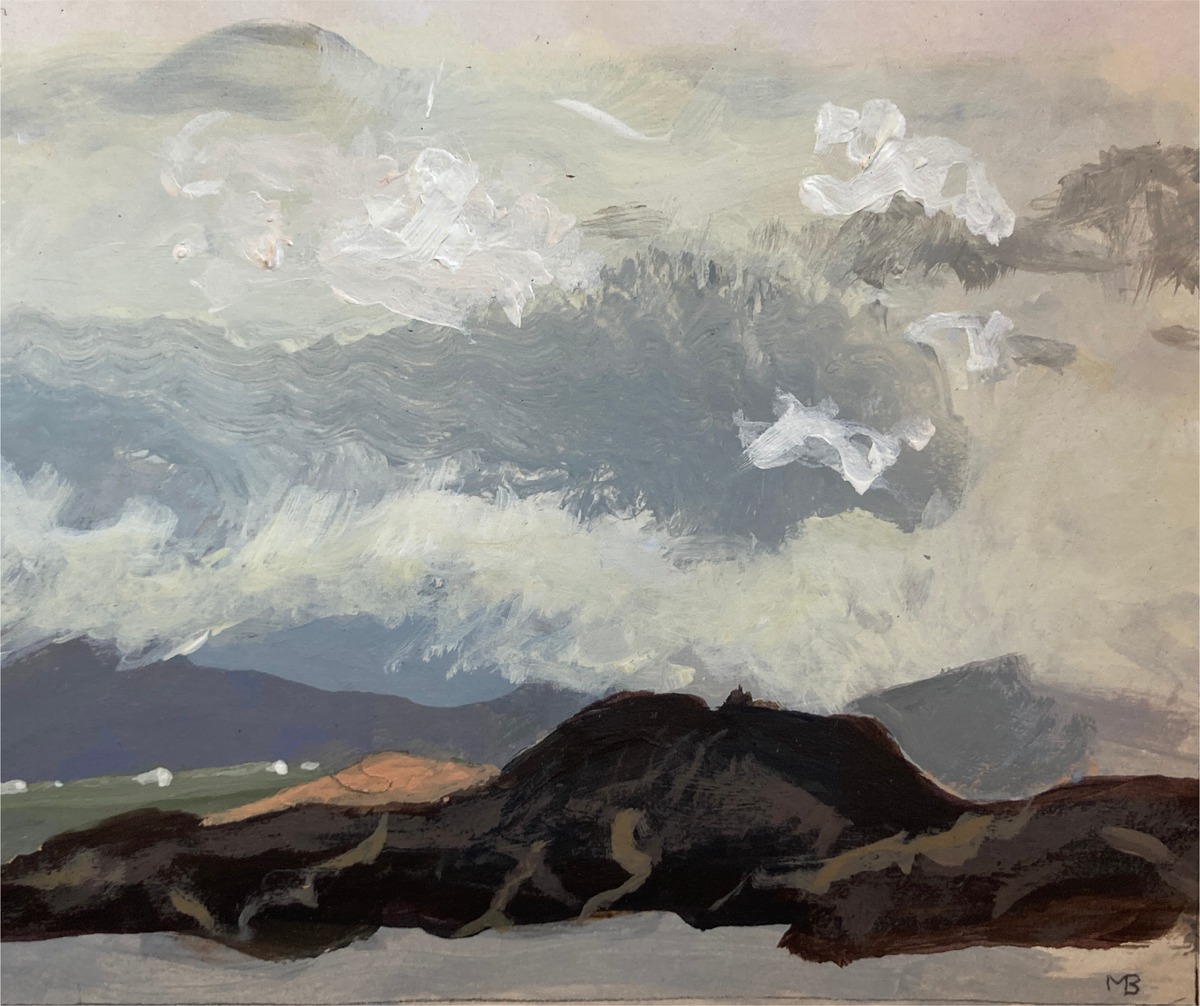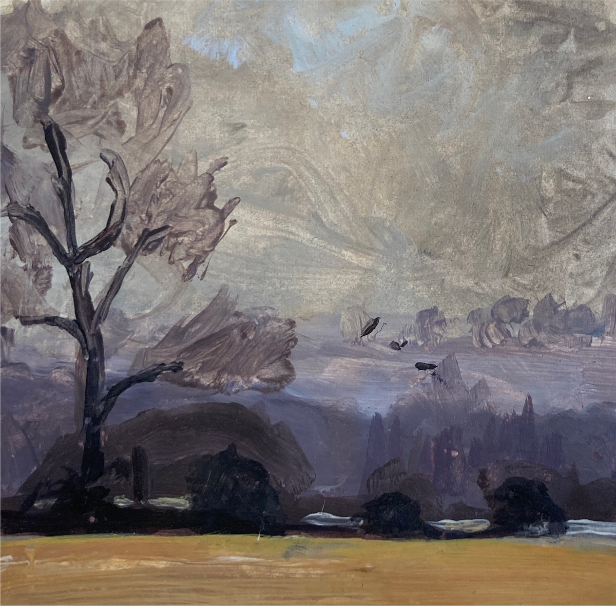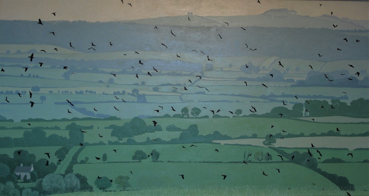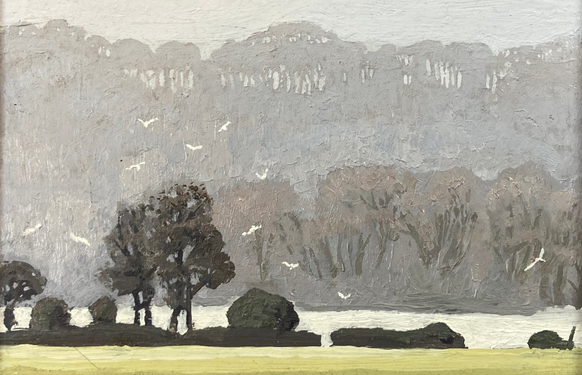 Larger work delights in the aerobatics of a cloud of rooks, black above quilted Spring fields and hedgerows in a spectrum of greens, soft in the morning mist. Small works are painterly and fluent, vignettes of older times observed and captured ‘en plein air’.