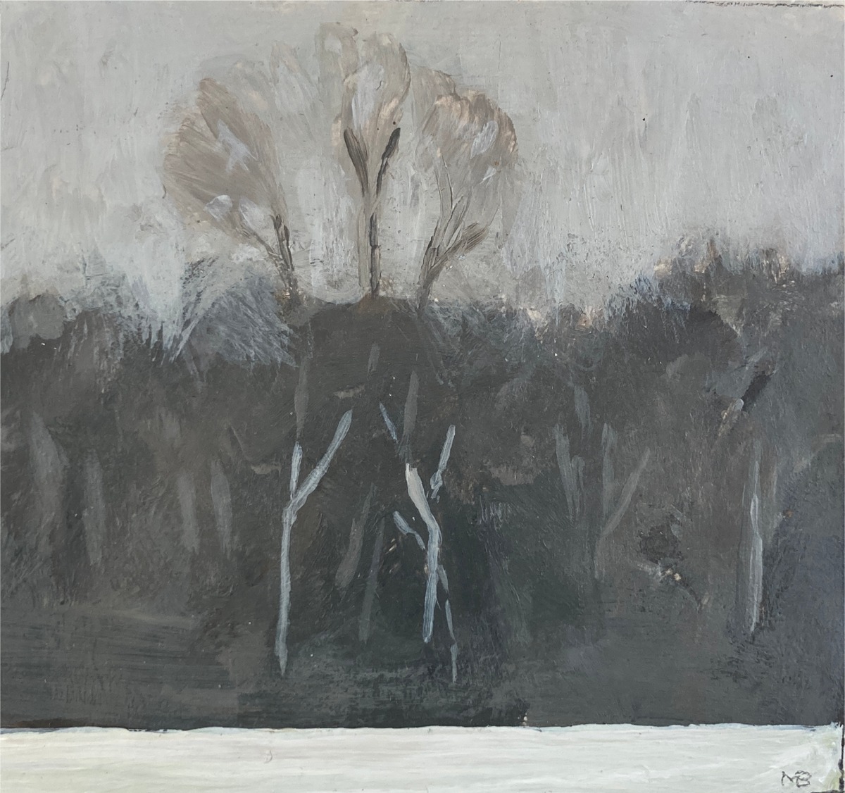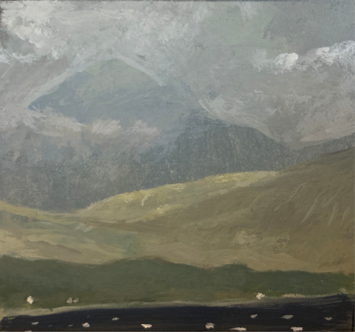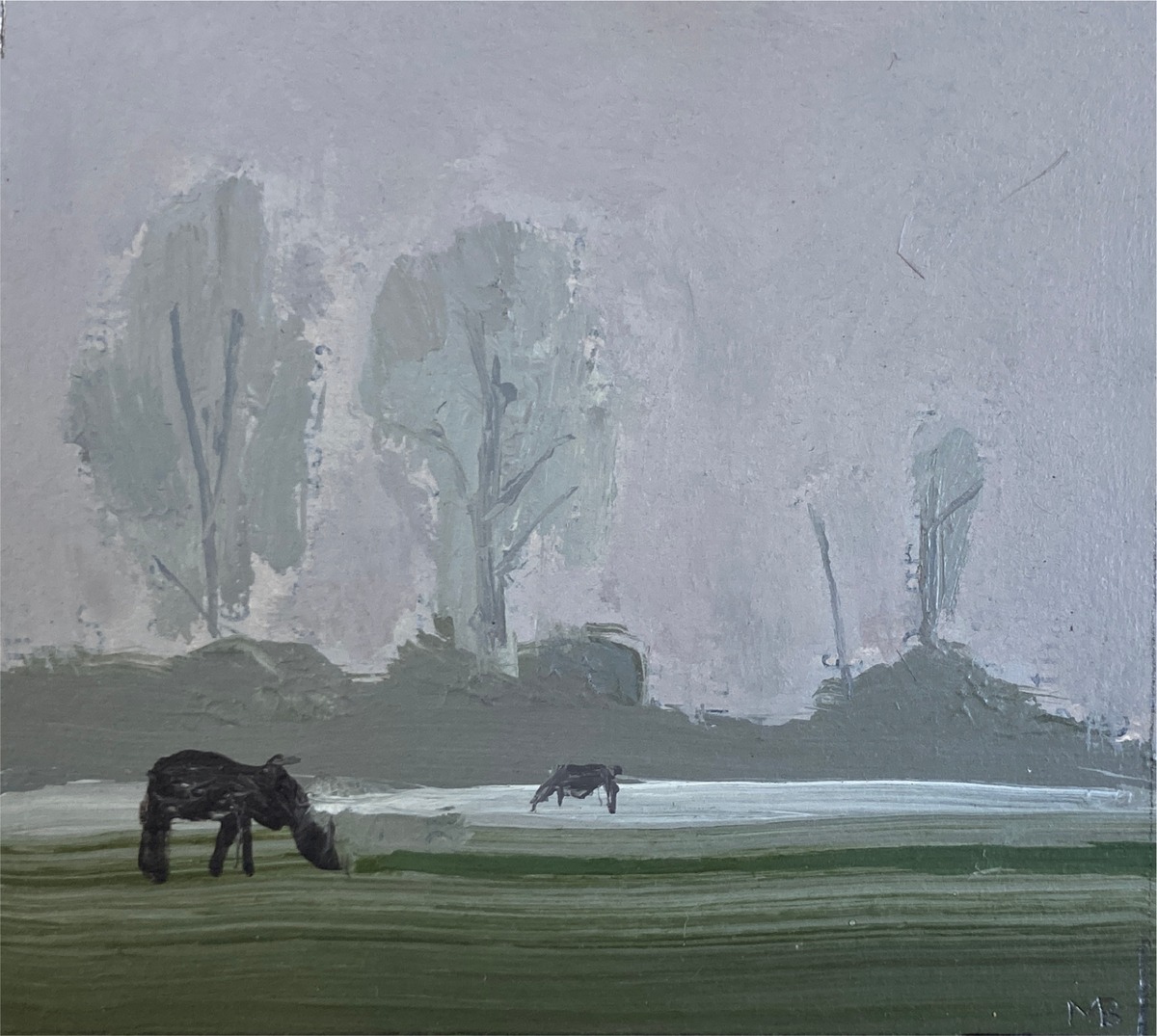 This collection of paintings provides an insight into his world: thunderous gun metal sky over sunlight grasses whilst scything hay on The Green; trees bare in winter against a muddy sky towards Wytham; the changing contours of the land and the quiet of horses on Port Meadow, their tails skirting around their legs in the wind.
