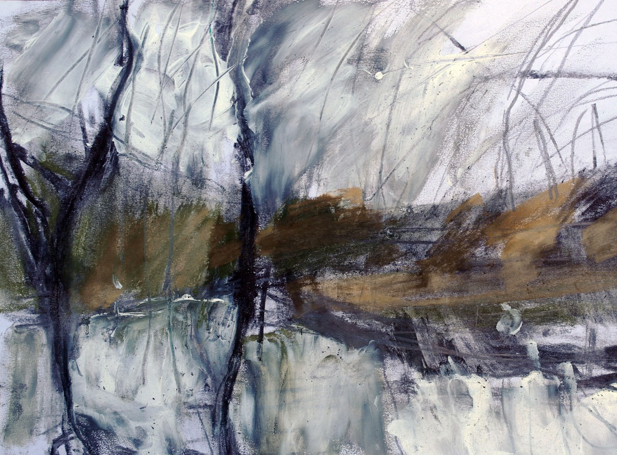 ‘Along By The Willows, Deep In Thought ‘ is the artist’s response to walking by the River Windrush in Oxfordshire. Winter is not yet over, but there is a promise of Spring and new beginnings in the cool blues and whites of the sky fresh against the earthier tones of the land, and the dance of the willow branches whipping in the wind. (Jenny Blyth, 2020)