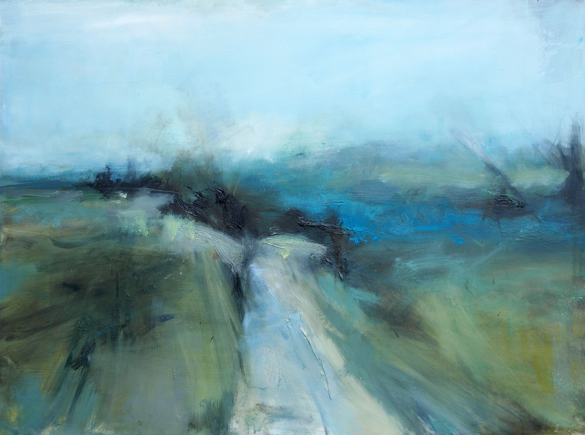 For those of you who know her work, you will find that Addy has moved on from what you might expect. She is painting beautiful and complex landscapes composed of layers of oil paint which individually retain both substance and translucency. The effect is to capture the fluidity of the firmament - sunlight spilling through clouds, earth and sky bathed in luminosity. Her subject is the landscape that she encounters around her which she recreates in the studio as photographic panoramic ‘sketches’. From that visual reference point, Addy creates paintings that echo her memories, thoughts, dreams and emotions – moments of ‘peak experience’. There is a strong autobiographical element in her work that colours her compositions with titles such as “The memory of the moment we first met”. An artist invites us to share their journey, yet the success of a painting is also determined by their ability to invite us to make our own. Addy Gardner is chasing beauty, and is successful on both counts.