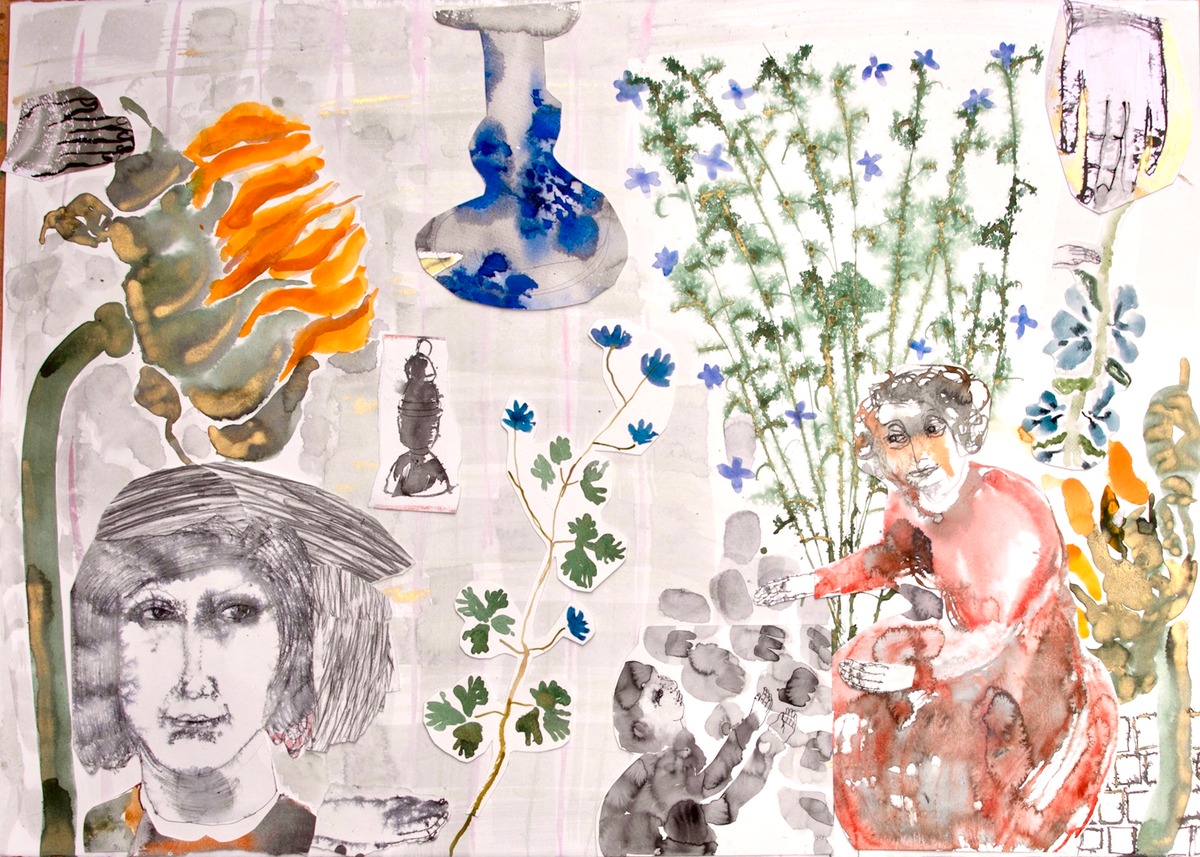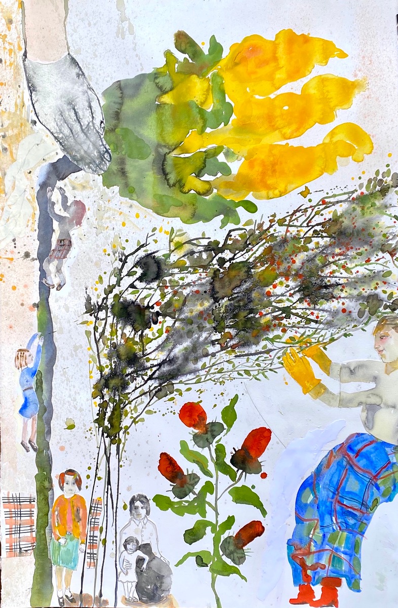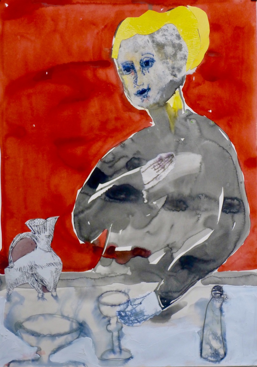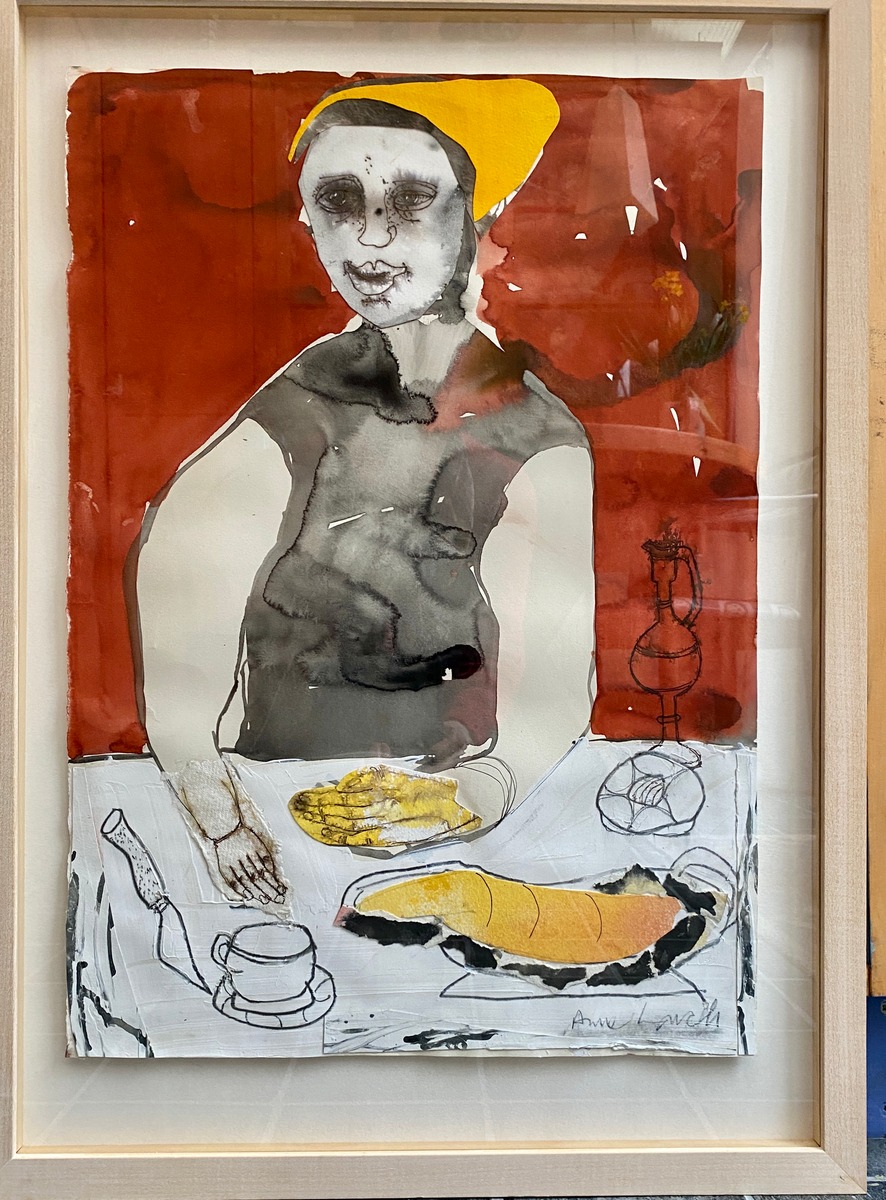 Food, storytelling and myths are at the heart of Anne Lynch’s paintings. Working in watercolour and occasional collage, she defies the traditional parameters of scale and content of her chosen medium. Although tutored by Elizabeth Blackadder, her work is more wild than pretty, nor is she drawn to the romance of landscape. Woodlands may entice her, but as a place to hide, or to protect her. Trees feature in her paintings because she enjoys the dancing silhouettes of maritime pines that spangle the Charantes Maritime coast where she has a home and studio. Dividing her time between UK and France, joie de vivre is a phrase that comes naturally to her.