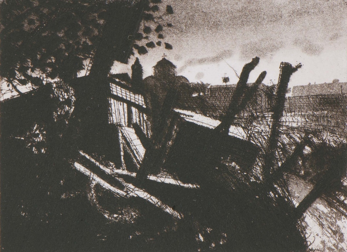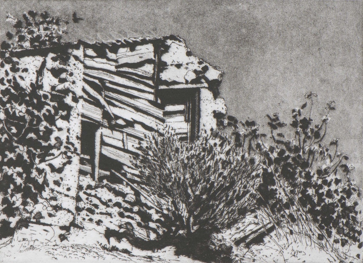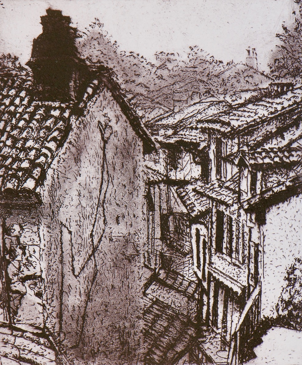 Over years of sun-saturated days working en plein air, Clarke has built an extensive portfolio of etchings, prints and drawings capturing the roof tops of small, unassuming French towns, shutters closed in the afternoon heat, the quiet of deserted side streets. But as drawn as he has been to the timeless beauty and romance of France and Italy, so he has been captivated by the raw, brittle landscape across Crete and Greece where houses are ever yet to be completed, workmans’ trucks loaded with the detritus of construction straddle the verge, the chaos of wires above ground, distinct and scratchy, contrasting with giant cactus and ancient olive trees that spill over dusty walls.