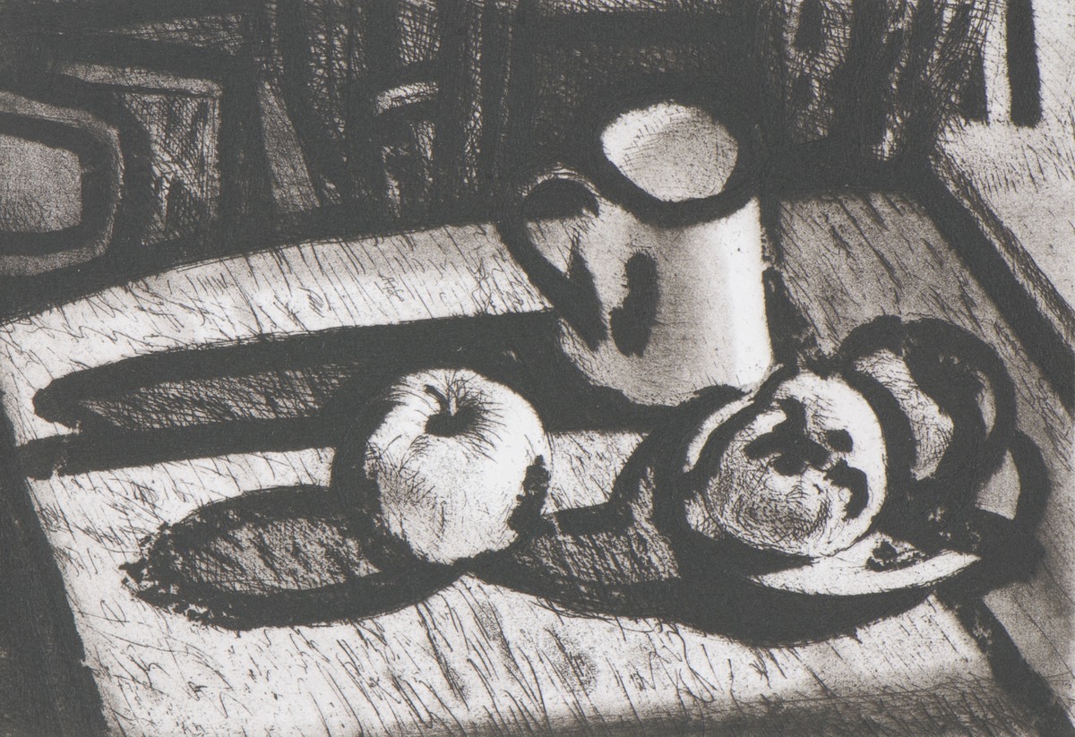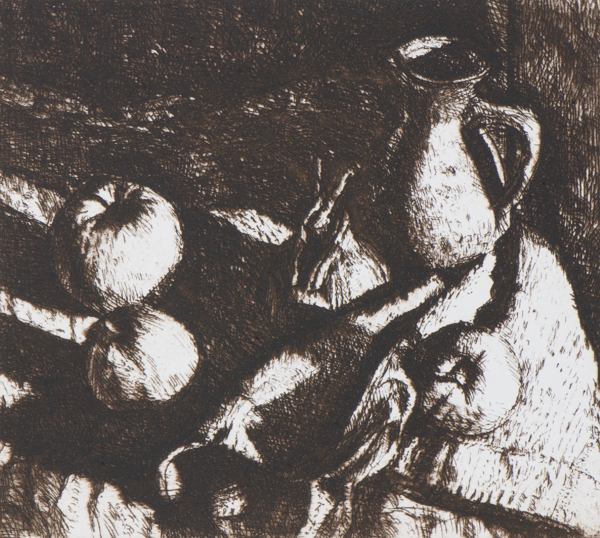 In Boxing and Shadows, strident lines in ink and charcoal, delineate grocers’ boxes, an enamel jug and potted plant. Two apples roll into the foreground. A subtle sepia wash of the empty box interior in the background, and the skin of the apple in the foreground, opens up the space. Clarke’s triumph of Chiaroscuro is complete. His composition is sublime, infused with the nuances and inflections of dancing light, defining form.